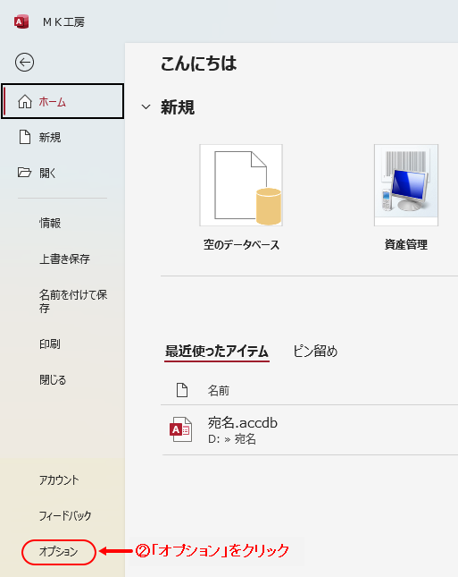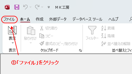 | マクロセキュリティは、使用するDB(データベース)が信頼できると判断した場合に、そのDBに関わる 警告メッセージとマクロ(自動処理プログラム)機能制限を解除する処置です。 この処置を適切に行い、Access環境側で、DBの使用を承認された範囲外に限定して制限します。 具体的には、Accessのオプション機能の中で、次の二つの設定を行います。 ●マクロの設定・・・・・・・・・・・・・「警告を表示してすべてのマクロを無効にする」を選択 (※PCで使用するAccessDB全てを対象に設定) ●信頼できる場所・・・・・・・・・・個々のDBごとに、その設置フォルダを登録し、その起動を許可 この2点の登録により、パソコン使用者が問題無しと承認したDBのみを使用可能にします。 その登録方法は下記の通りです。 ≪Accessのオプション機能を立ち上げ≫ Access画面左上端の[ファイル]ボタンをクリックします。 メニューリストが表示されます。 |