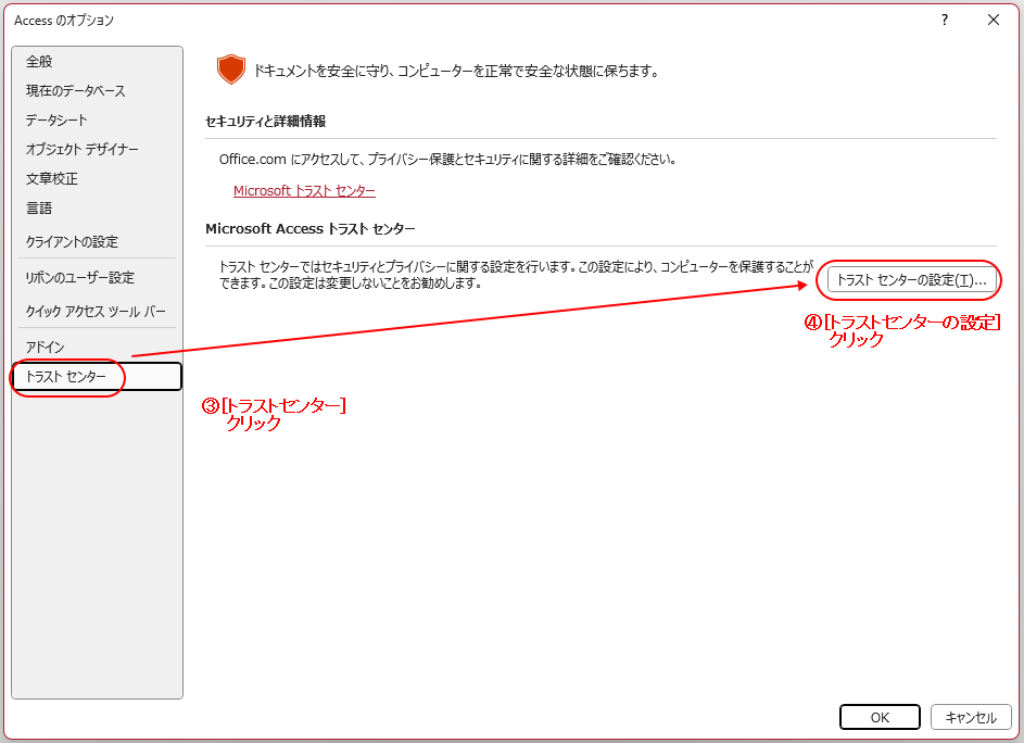 「Accessのオプション」画面が表示されます。 画面左側のメニューリストから[トラストセンター]をクリックします。 「トラストセンター」ページが表示されましたら、[トラストセンターの設定]ボタンをクリックします。 |