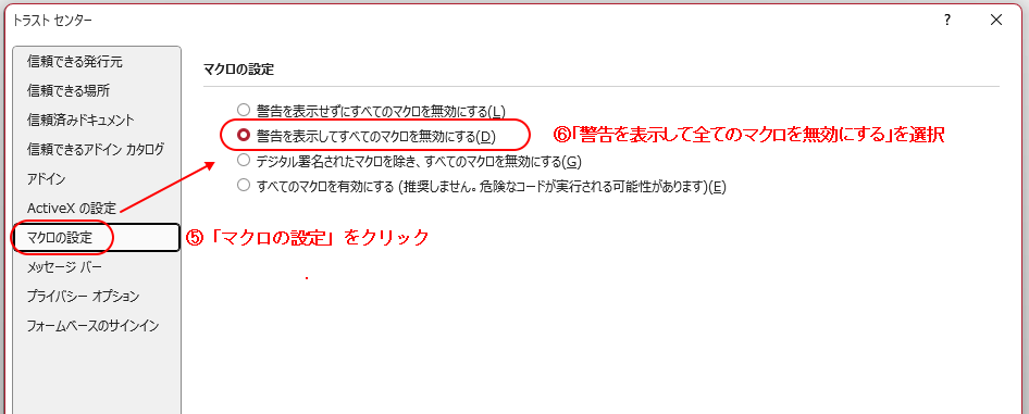 ≪マクロの設定≫ 「トラストセンター」画面が表示されます。 この画面の機能により、マクロセキュリティに関する二つの設定作業を行います。 二つの作業の内、最初に「マクロの設定」を説明します。 左側にあるメニューリストから、[マクロの設定]をクリックします。 「マクロの設定」はマクロに関して、それを無効にして使用不可にするか否かを選択し設定ます。 こちらで、「警告を表示してすべてのマクロを無効にする」を選択します。 これにより、悪意を持ったマクロ(自動処理プログラム)機能の働きを制限します。 この設定は、全てのAccessDBに共通しますので、そのPCのAccessで一度設定済みであれば、この作業はパスできます。 |
