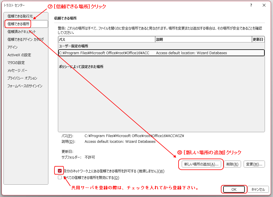 ≪信頼できる場所の設定≫ 次に、「トラストセンター」画面の左側にあるメニューリストから、[信頼できる場所]をクリックします。 「信頼できる場所」のページが表示されます。 [新しい場所の追加]ボタンをクリックして下さい。 |
